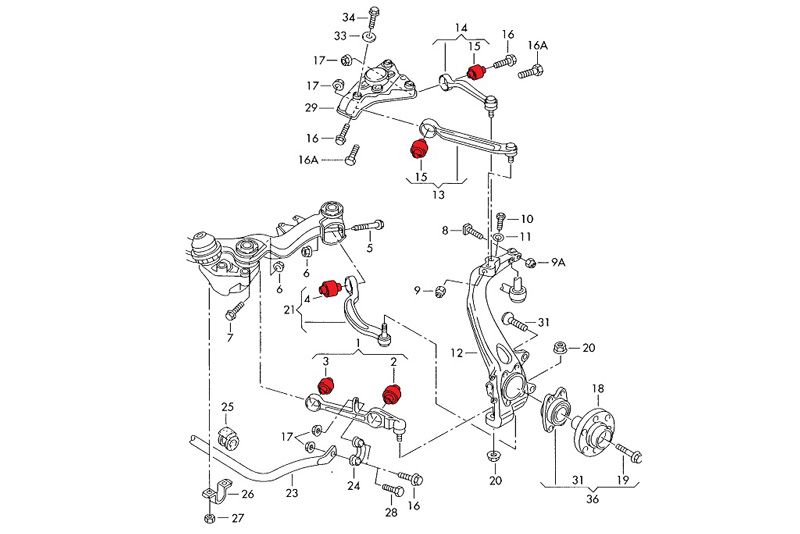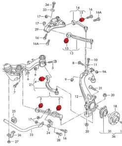 Komplettsatz (in Schwarz) (L+R) für die vorderen Querlenker der Audi B5 / C5 Plattform. Bei diesen Modellen mit der 4-Lenker Achse, sind diese eh sehr anfällig, da kommt eine Umrüstung auf PU-Lagerung genau richtig.